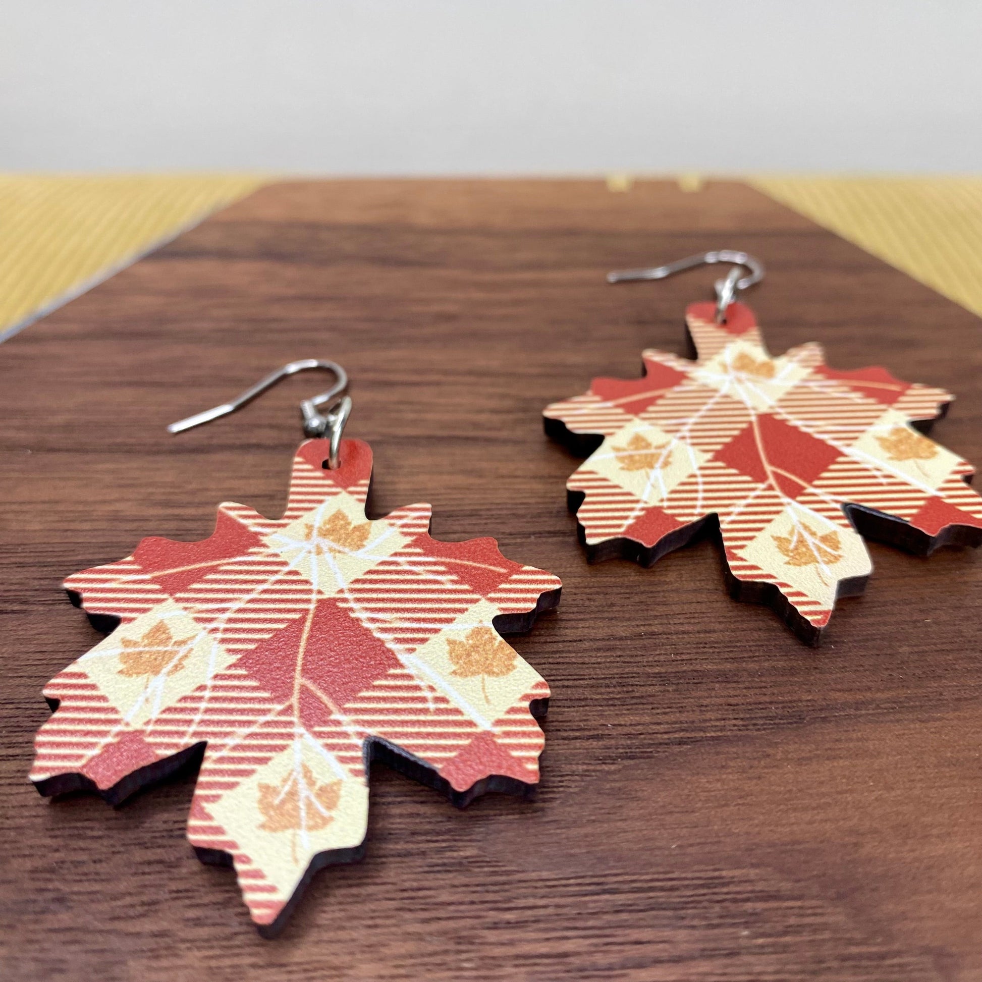 Wooden Dangle Earrings - Fall - Plaid Leaf