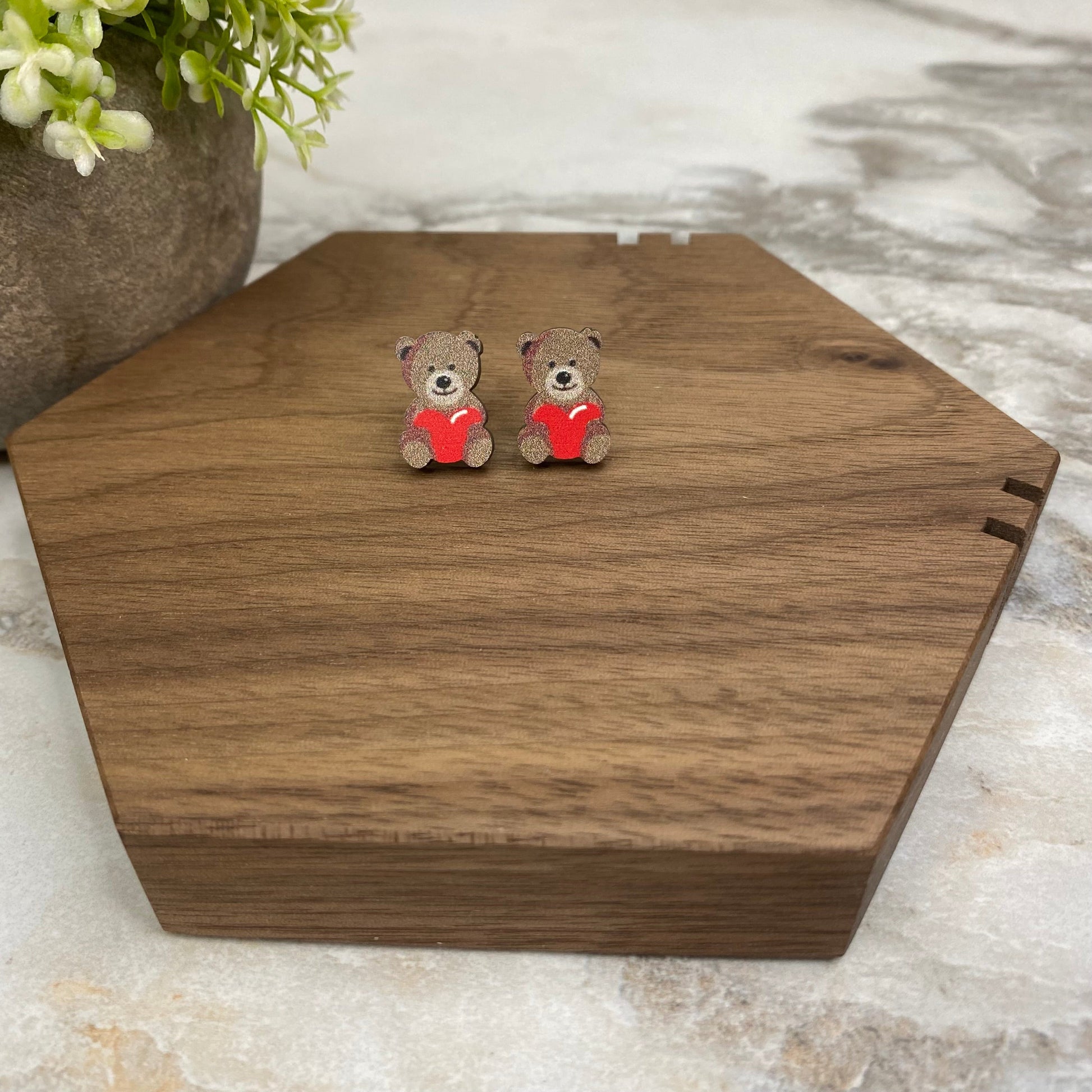 Wooden Stud Earrings - Heart Bear - #12