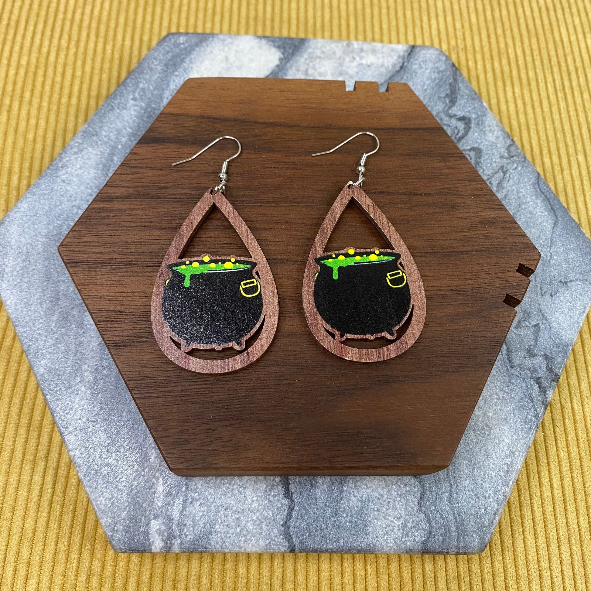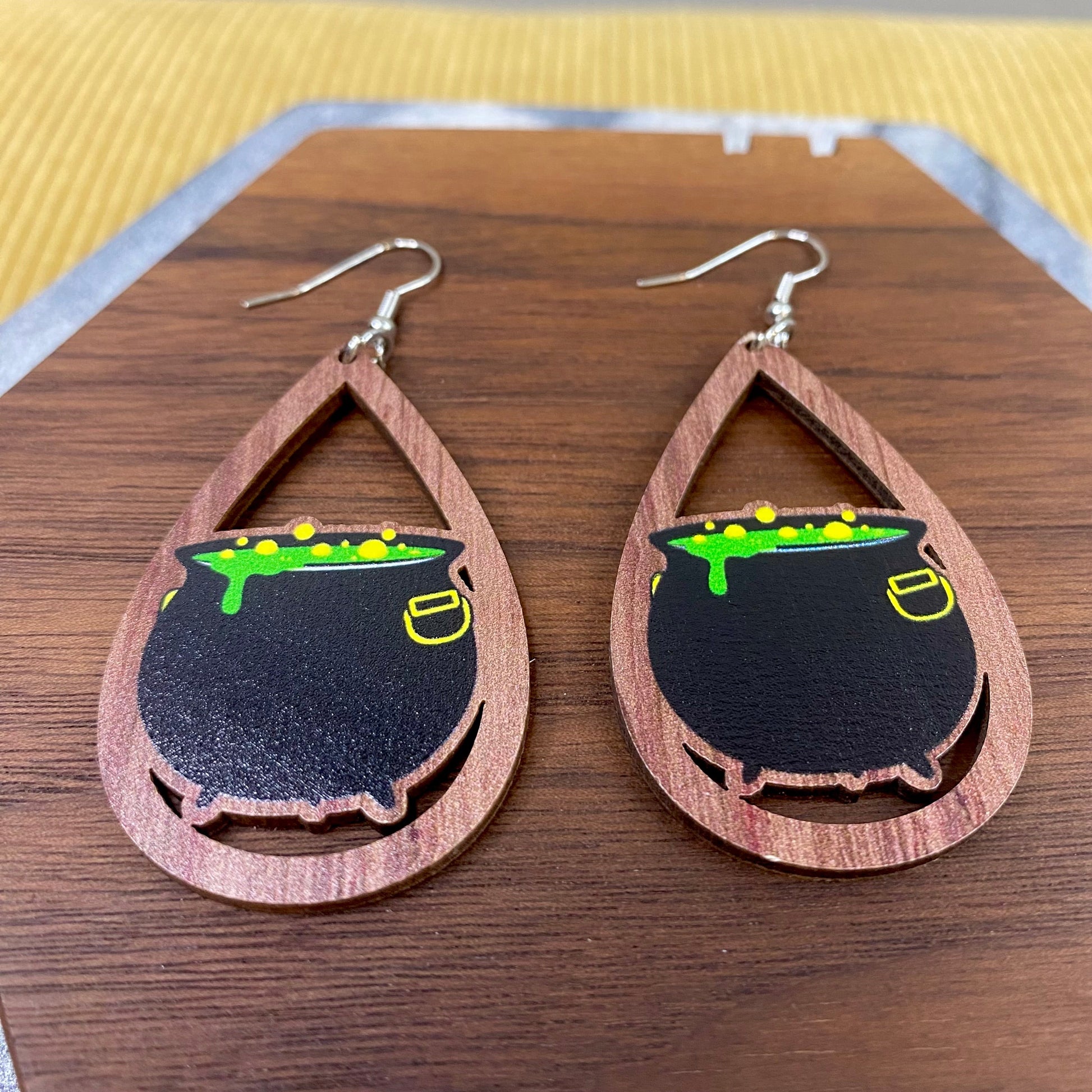 Wooden Teardrop Cutout Earrings - Halloween - Cauldron